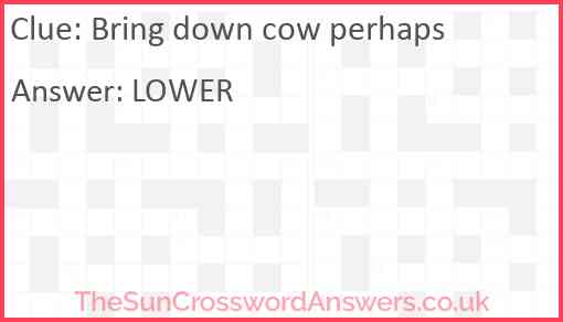 Bring down cow perhaps is a crossword clue for which we have 1 possible answer and we have spotted 2 times in our database. This crossword clue was last seen on 27 March 2025 in The Sun Cryptic Crossword puzzle!