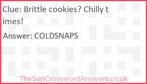 Brittle cookies? Chilly times! is a crossword clue for which we have 1 possible answer and we have spotted 1 times in our database. This crossword clue was last seen on 22 August 2024 in The Sun Cryptic Crossword puzzle!