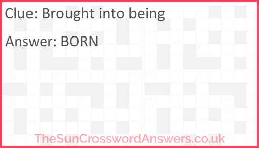 Brought into being is a crossword clue for which we have 1 possible answer and we have spotted 5 times in our database. This crossword clue was last seen on 25 October 2024 in The Sun Coffee Time Crossword puzzle!