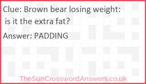 Brown bear losing weight: is it the extra fat? is a crossword clue for which we have 1 possible answer and we have spotted 1 times in our database. This crossword clue was last seen on 07 December 2024 in The Sun Cryptic Crossword puzzle!