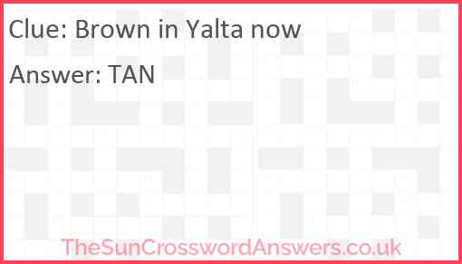Brown in Yalta now is a crossword clue for which we have 1 possible answer and we have spotted 2 times in our database. This crossword clue was last seen on 01 August 2024 in The Sun Cryptic Crossword puzzle!