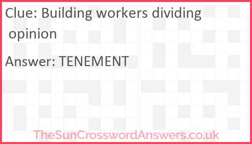 Building workers dividing opinion is a crossword clue for which we have 1 possible answer and we have spotted 3 times in our database. This crossword clue was last seen on 29 June 2024 in The Sun Cryptic Crossword puzzle!