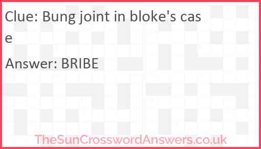 Bung joint in bloke's case is a crossword clue for which we have 1 possible answer and we have spotted 1 times in our database. This crossword clue was last seen on 15 February 2024 in The Sun Cryptic Crossword puzzle!