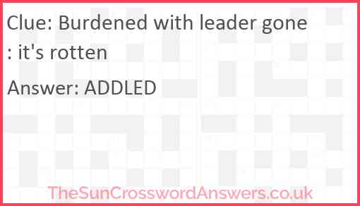 Burdened with leader gone: it's rotten is a crossword clue for which we have 1 possible answer and we have spotted 2 times in our database. This crossword clue was last seen on 19 July 2025 in The Sun Cryptic Crossword puzzle!