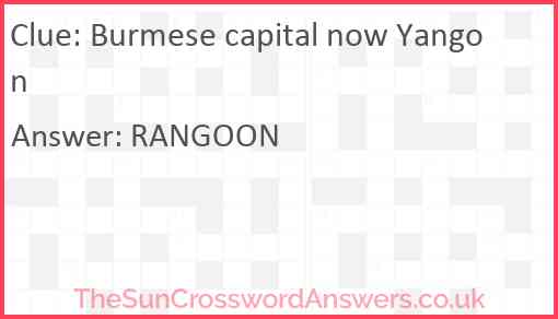 Burmese capital now Yangon is a crossword clue for which we have 1 possible answer and we have spotted 1 times in our database. This crossword clue was last seen on 01 June 2024 in The Sun Coffee Time Crossword puzzle!