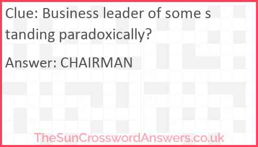 Business leader of some standing paradoxically? is a crossword clue for which we have 1 possible answer and we have spotted 3 times in our database. This crossword clue was last seen on 23 July 2023 in The Sun Cryptic Crossword puzzle!