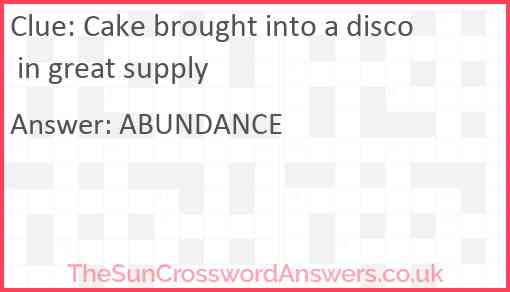 Cake brought into a disco in great supply is a crossword clue for which we have 1 possible answer and we have spotted 2 times in our database. This crossword clue was last seen on 21 December 2023 in The Sun Cryptic Crossword puzzle!