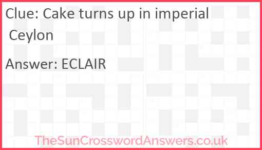 Cake turns up in imperial Ceylon is a crossword clue for which we have 1 possible answer and we have spotted 1 times in our database. This crossword clue was last seen on 15 February 2021 in The Sun Cryptic Crossword puzzle!