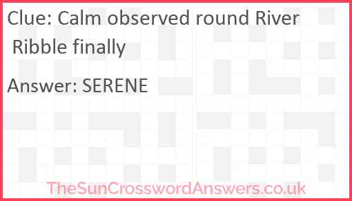 Calm observed round River Ribble finally is a crossword clue for which we have 1 possible answer and we have spotted 2 times in our database. This crossword clue was last seen on 23 July 2025 in The Sun Cryptic Crossword puzzle!
