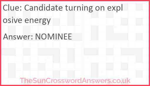 Candidate turning on explosive energy is a crossword clue for which we have 1 possible answer and we have spotted 2 times in our database. This crossword clue was last seen on 13 December 2023 in The Sun Cryptic Crossword puzzle!