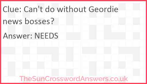 Can't do without Geordie news bosses? is a crossword clue for which we have 1 possible answer and we have spotted 2 times in our database. This crossword clue was last seen on 26 February 2025 in The Sun Cryptic Crossword puzzle!