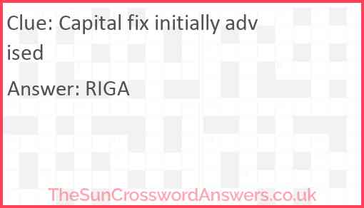 Capital fix initially advised is a crossword clue for which we have 1 possible answer and we have spotted 1 times in our database. This crossword clue was last seen on 21 June 2019 in The Sun Cryptic Crossword puzzle!