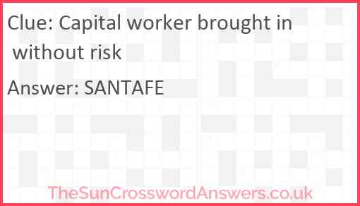 Capital worker brought in without risk is a crossword clue for which we have 1 possible answer and we have spotted 1 times in our database. This crossword clue was last seen on 19 September 2024 in The Sun Cryptic Crossword puzzle!