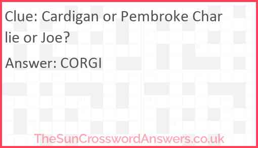 Cardigan or Pembroke Charlie or Joe? is a crossword clue for which we have 1 possible answer and we have spotted 1 times in our database. This crossword clue was last seen on 16 August 2022 in The Sun Cryptic Crossword puzzle!