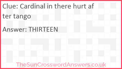 Cardinal in there hurt after tango is a crossword clue for which we have 1 possible answer and we have spotted 1 times in our database. This crossword clue was last seen on 29 September 2024 in The Sun Cryptic Crossword puzzle!
