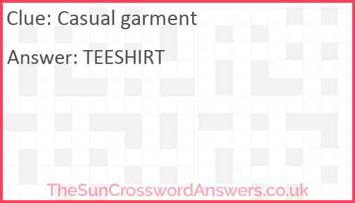 Casual garment is a crossword clue for which we have 1 possible answer and we have spotted 2 times in our database. This crossword clue was last seen on 02 July 2021 in The Sun Coffee Time Crossword puzzle!