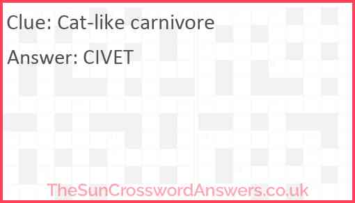 Cat-like carnivore is a crossword clue for which we have 1 possible answer and we have spotted 2 times in our database. This crossword clue was last seen on 19 September 2023 in The Sun Coffee Time Crossword puzzle!