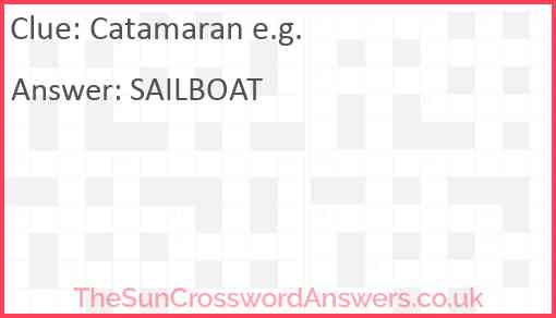 Catamaran e.g. is a crossword clue for which we have 1 possible answer and we have spotted 1 times in our database. This crossword clue was last seen on 01 December 2021 in The Sun Coffee Time Crossword puzzle!