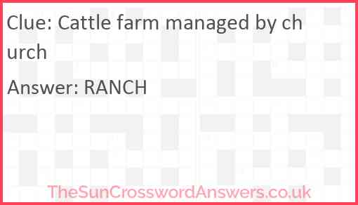 Cattle farm managed by church is a crossword clue for which we have 1 possible answer and we have spotted 3 times in our database. This crossword clue was last seen on 21 June 2024 in The Sun Cryptic Crossword puzzle!