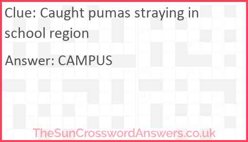 Caught pumas straying in school region is a crossword clue for which we have 1 possible answer and we have spotted 2 times in our database. This crossword clue was last seen on 04 October 2023 in The Sun Cryptic Crossword puzzle!