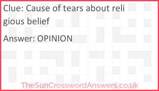 Cause of tears about religious belief is a crossword clue for which we have 1 possible answer and we have spotted 3 times in our database. This crossword clue was last seen on 01 March 2024 in The Sun Cryptic Crossword puzzle!