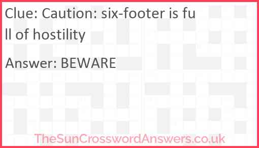Caution: six-footer is full of hostility is a crossword clue for which we have 1 possible answer and we have spotted 2 times in our database. This crossword clue was last seen on 29 May 2025 in The Sun Cryptic Crossword puzzle!