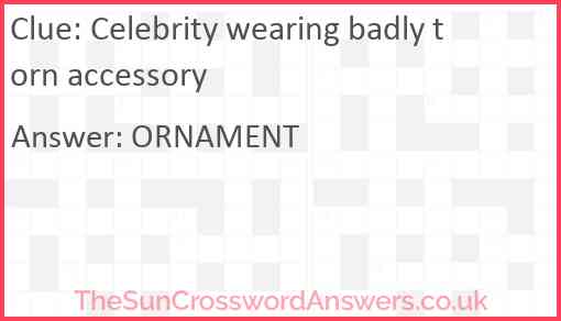 Celebrity wearing badly torn accessory is a crossword clue for which we have 1 possible answer and we have spotted 3 times in our database. This crossword clue was last seen on 30 August 2024 in The Sun Cryptic Crossword puzzle!