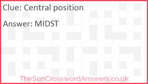 Central position is a crossword clue for which we have 1 possible answer and we have spotted 1 times in our database. This crossword clue was last seen on 28 April 2022 in The Sun Coffee Time Crossword puzzle!