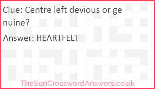 Centre left devious or genuine? is a crossword clue for which we have 1 possible answer and we have spotted 1 times in our database. This crossword clue was last seen on 11 July 2024 in The Sun Cryptic Crossword puzzle!