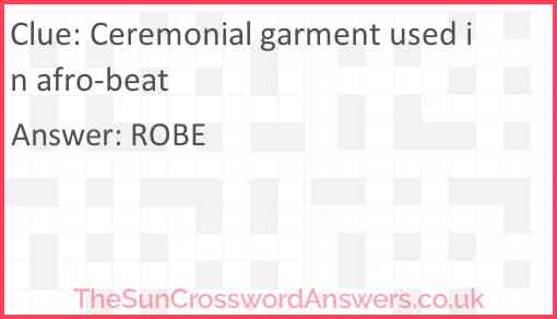 Ceremonial garment used in afro-beat is a crossword clue for which we have 1 possible answer and we have spotted 2 times in our database. This crossword clue was last seen on 03 June 2024 in The Sun Cryptic Crossword puzzle!