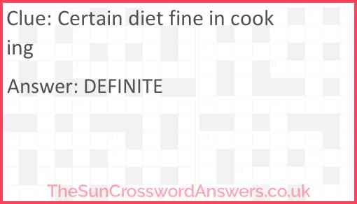 Certain diet fine in cooking is a crossword clue for which we have 1 possible answer and we have spotted 3 times in our database. This crossword clue was last seen on 26 January 2025 in The Sun Cryptic Crossword puzzle!