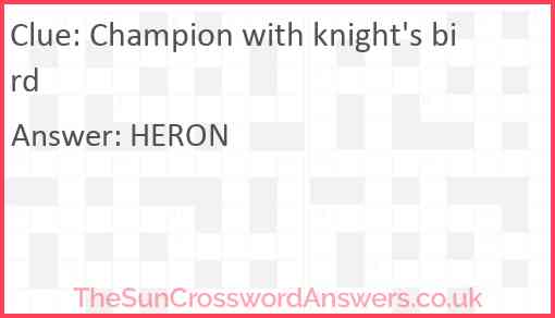 Champion with knight's bird is a crossword clue for which we have 1 possible answer and we have spotted 1 times in our database. This crossword clue was last seen on 27 January 2022 in The Sun Cryptic Crossword puzzle!