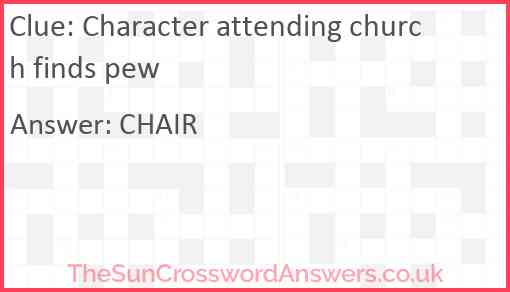 Character attending church finds pew is a crossword clue for which we have 1 possible answer and we have spotted 1 times in our database. This crossword clue was last seen on 30 March 2025 in The Sun Cryptic Crossword puzzle!