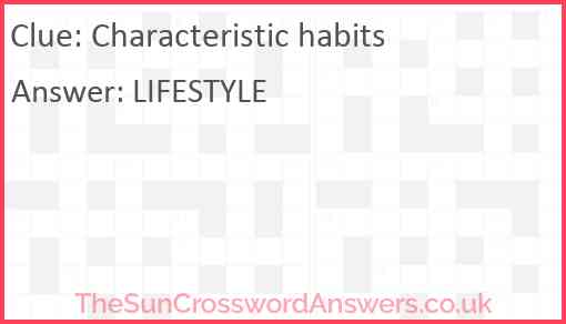Characteristic habits is a crossword clue for which we have 1 possible answer and we have spotted 2 times in our database. This crossword clue was last seen on 25 August 2023 in The Sun Coffee Time Crossword puzzle!