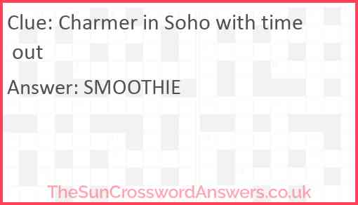 Charmer in Soho with time out is a crossword clue for which we have 1 possible answer and we have spotted 2 times in our database. This crossword clue was last seen on 13 May 2024 in The Sun Cryptic Crossword puzzle!
