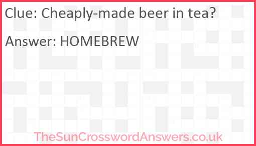 Cheaply-made beer in tea? is a crossword clue for which we have 1 possible answer and we have spotted 2 times in our database. This crossword clue was last seen on 22 December 2020 in The Sun Cryptic Crossword puzzle!