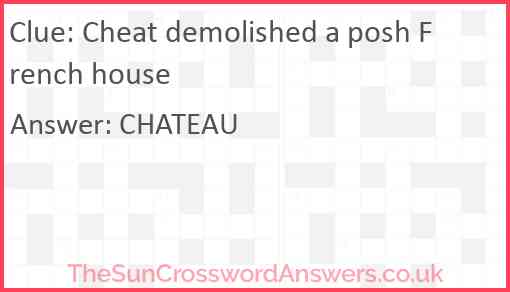 Cheat demolished a posh French house is a crossword clue for which we have 1 possible answer and we have spotted 2 times in our database. This crossword clue was last seen on 25 August 2022 in The Sun Cryptic Crossword puzzle!