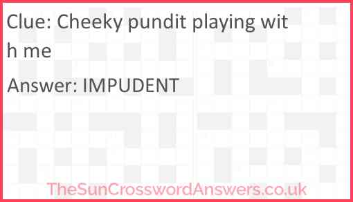 Cheeky pundit playing with me is a crossword clue for which we have 1 possible answer and we have spotted 2 times in our database. This crossword clue was last seen on 06 May 2022 in The Sun Cryptic Crossword puzzle!