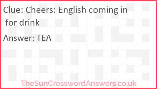 Cheers: English coming in for drink is a crossword clue for which we have 1 possible answer and we have spotted 1 times in our database. This crossword clue was last seen on 12 June 2022 in The Sun Cryptic Crossword puzzle!