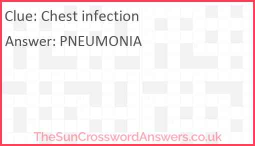 Chest infection is a crossword clue for which we have 1 possible answer and we have spotted 2 times in our database. This crossword clue was last seen on 31 July 2025 in The Sun Coffee Time Crossword puzzle!