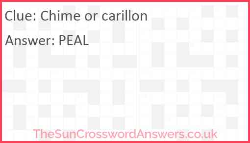 Chime or carillon is a crossword clue for which we have 1 possible answer and we have spotted 1 times in our database. This crossword clue was last seen on 26 March 2024 in The Sun Coffee Time Crossword puzzle!