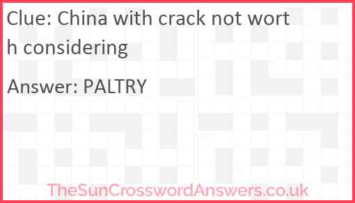 China with crack not worth considering is a crossword clue for which we have 1 possible answer and we have spotted 1 times in our database. This crossword clue was last seen on 13 October 2020 in The Sun Cryptic Crossword puzzle!