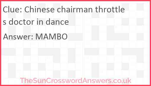 Chinese chairman throttles doctor in dance is a crossword clue for which we have 1 possible answer and we have spotted 2 times in our database. This crossword clue was last seen on 20 July 2023 in The Sun Cryptic Crossword puzzle!