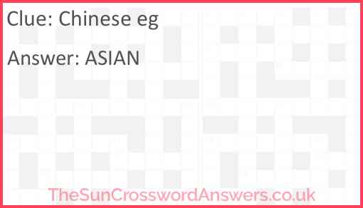 Chinese e.g. is a crossword clue for which we have 1 possible answer and we have spotted 4 times in our database. This crossword clue was last seen on 28 April 2024 in The Sun Coffee Time Crossword puzzle!