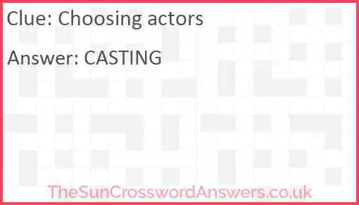 Choosing actors is a crossword clue for which we have 1 possible answer and we have spotted 5 times in our database. This crossword clue was last seen on 26 February 2025 in The Sun Coffee Time Crossword puzzle!