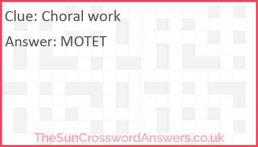 Choral work is a crossword clue for which we have 1 possible answer and we have spotted 2 times in our database. This crossword clue was last seen on 20 December 2024 in The Sun Coffee Time Crossword puzzle!