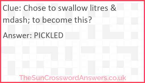 Chose to swallow litres — to become this? is a crossword clue for which we have 1 possible answer and we have spotted 1 times in our database. This crossword clue was last seen on 21 February 2019 in The Sun Cryptic Crossword puzzle!