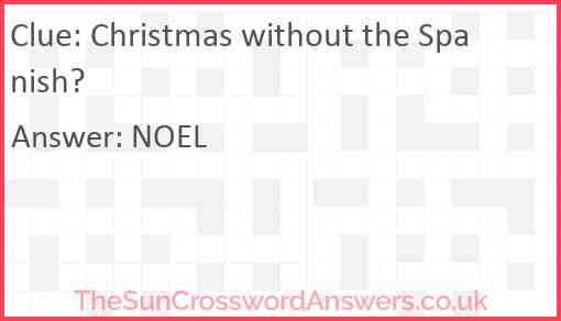 Christmas without the Spanish? is a crossword clue for which we have 1 possible answer and we have spotted 2 times in our database. This crossword clue was last seen on 18 September 2024 in The Sun Cryptic Crossword puzzle!