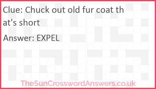 Chuck out old fur coat that's short is a crossword clue for which we have 1 possible answer and we have spotted 2 times in our database. This crossword clue was last seen on 27 February 2025 in The Sun Cryptic Crossword puzzle!