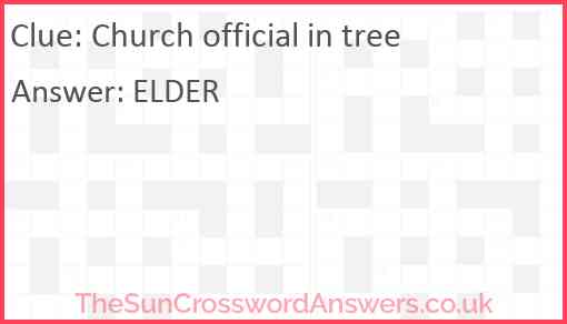 Church official in tree is a crossword clue for which we have 1 possible answer and we have spotted 3 times in our database. This crossword clue was last seen on 06 April 2023 in The Sun Cryptic Crossword puzzle!
